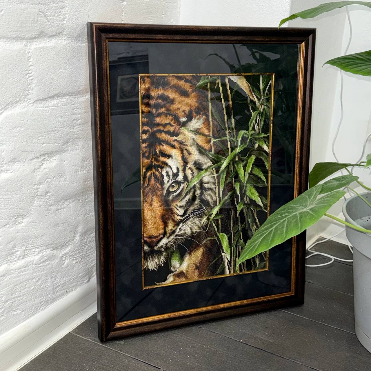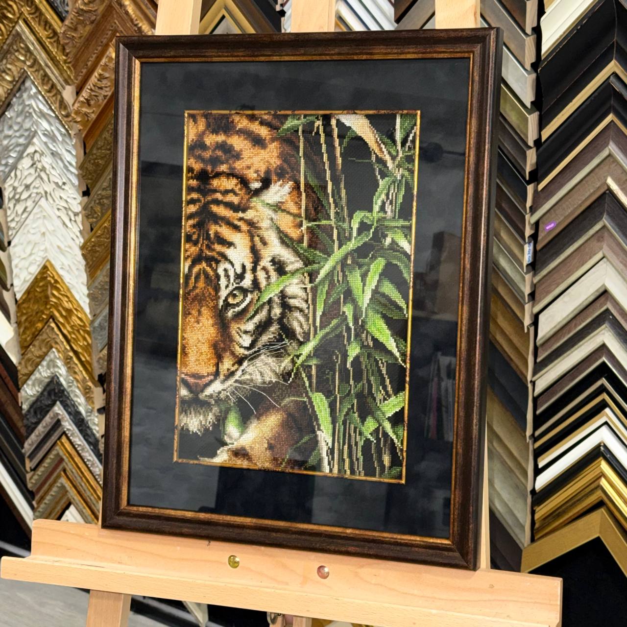 На примере проекта с вышивкой тигра, пробирающегося сквозь бамбуковые заросли, можно наглядно увидеть, как важно профессиональное оформление. Подробно об услуге «Оформление вышивок в багет».