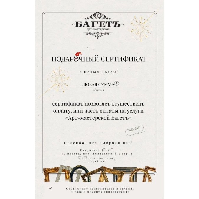 Сертификат позволяет осуществить оплату, или часть оплаты на услуги «Арт-мастерской Багетъ» на любую сумму