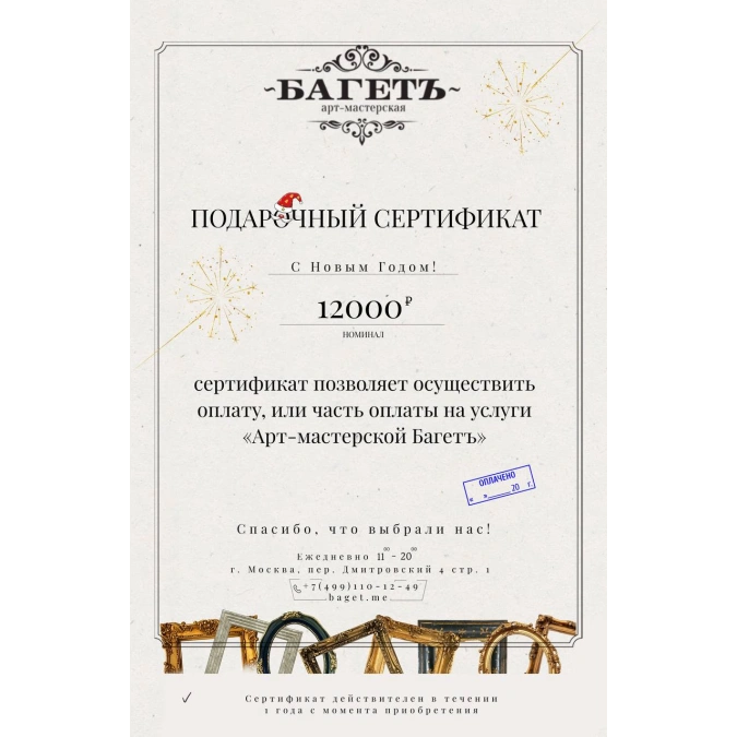 Сертификат позволяет осуществить оплату, или часть оплаты на услуги «Арт-мастерской Багетъ» на сумму 12 тр.